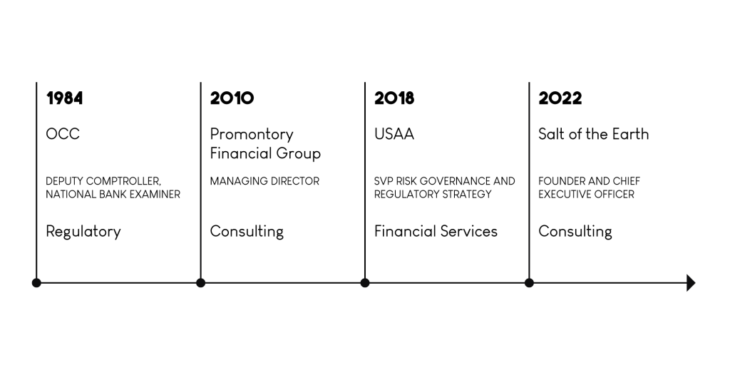 Kathryn Dick (she/her) is the Founder and Chief Executive Officer of Salt of the Earth Consulting (SOTE), leveraging her accomplished career and reputation as a sought-after advisor to financial institution clients. Kathy has deep experience in navigating regulatory issues, governance and risk management challenges, strategic initiatives, and compliance requirements.
